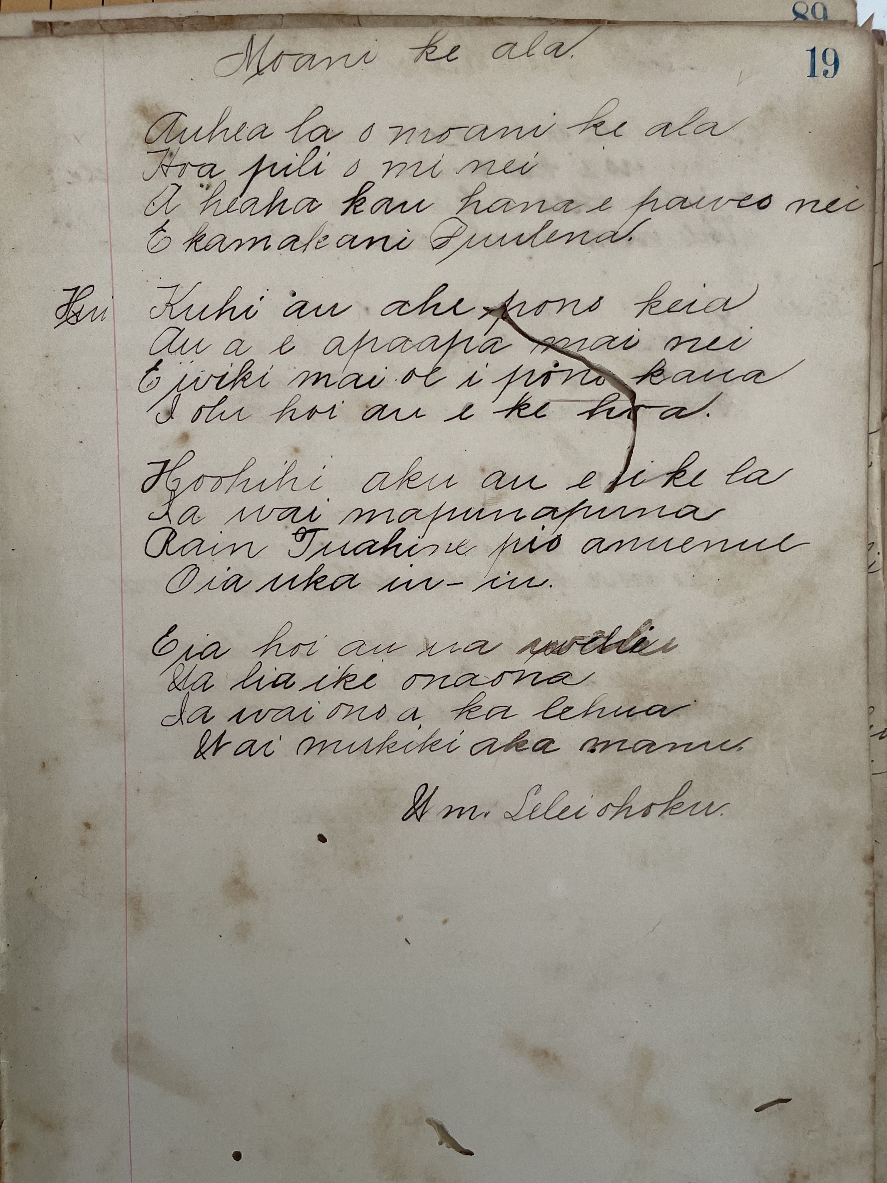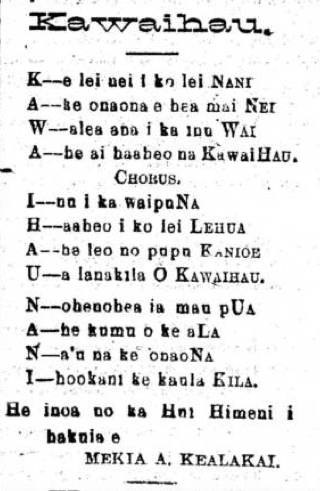 Originally composed as a mele hua inoa in which the first letter of each line proclaims “KAWAIHAU NANI”, Mekia Kealakai fashions a colorful moment in history into song to honor the Kawaihau Glee Club. The elusive poetry alludes to desire and attraction, singing and recreational activity, and the reasons for which members of the club boasted about their loyalty to it.