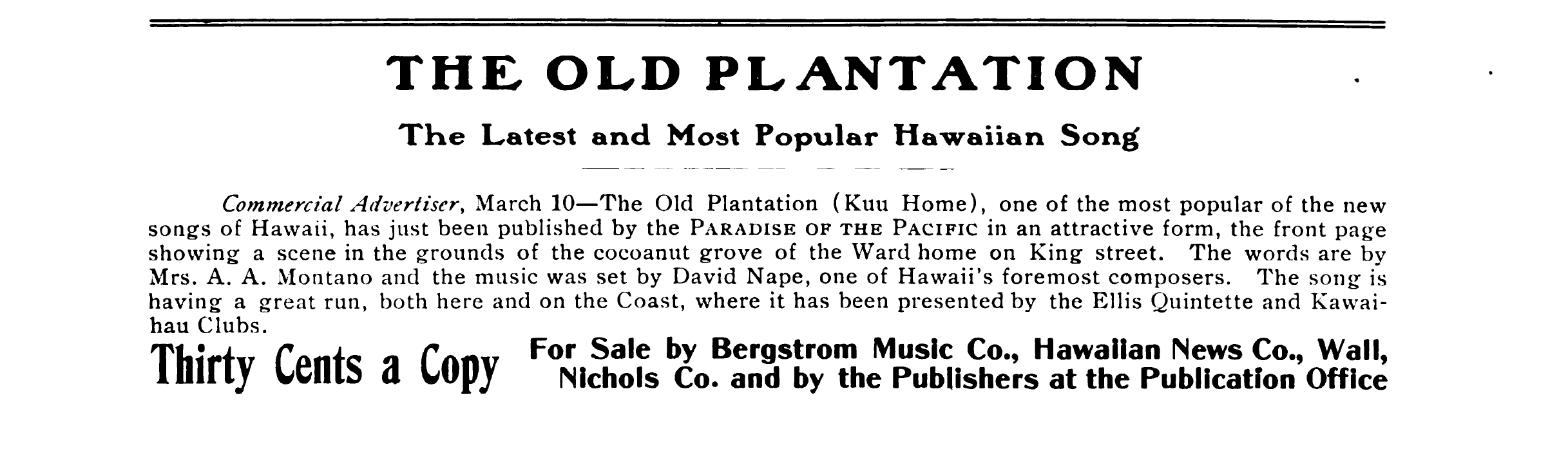 Love issues forth like the fragrance of blossoms at Old Plantation. In their mele, co-composers Mary Montano and David Nape revel in the warm hospitality of this home, now the current site of the Neal Blaisdell Center, whose amenities featured fish ponds, streams, and a water wheel. Sights, sounds, and senses experienced at the home become metaphors for fond memories held by intimates of the Ward ʻohana.