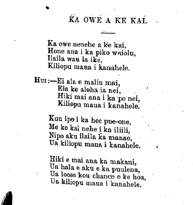 This compelling composition by Ke Kamāliʻi Miriam Likelike, the third sibling of Nā Lani ʻEhā, the Royal Four, alludes to the delights shared between two sweethearts, whose tryst seems to have a forlorn ending. The poetry draws upon sounds of the natural environment and other elemental forces to describe the physical sensations and emotional outcomes that befell the lovers in their pursuit of one another.